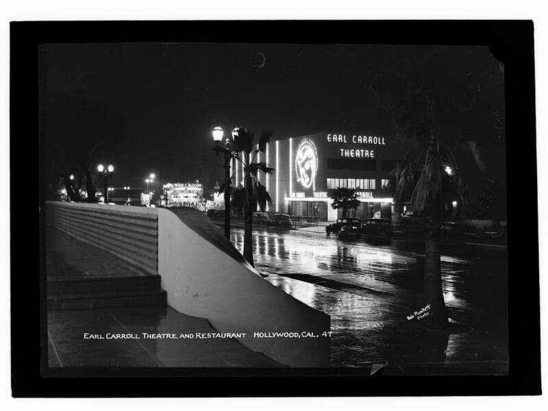 Image of the Earl Carroll Theatre and Restaurant with automobiles parked on Sunset Boulevard in Hollywood, California, with a sign that reads "Earl Carroll Theatre."