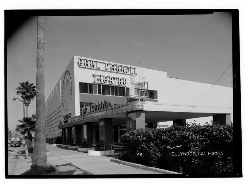 Image of the Earl Carroll Theatre and Restaurant with automobiles parked on Sunset Boulevard in Hollywood, California, with a sign that reads "Earl Carroll Theatre."