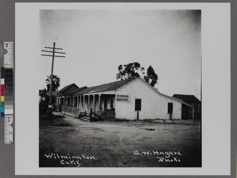 View of a building in Wilmington, California, with a sign that says "Wilmington Journal. Commercial printing." A smaller building next door has a sign that says "Office. Columbian Investment Co. Real Estate."