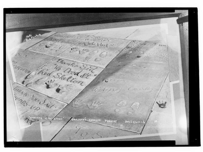 View of signatures and Imprints of the Stars in cement in the forecourt of Grauman's Chinese Theatre in Hollywood, California. Celebrity imprints include Shirley Temple, Jack Benny, Edgar Bergen, Charlie McCarthy, and Joe E. Brown.