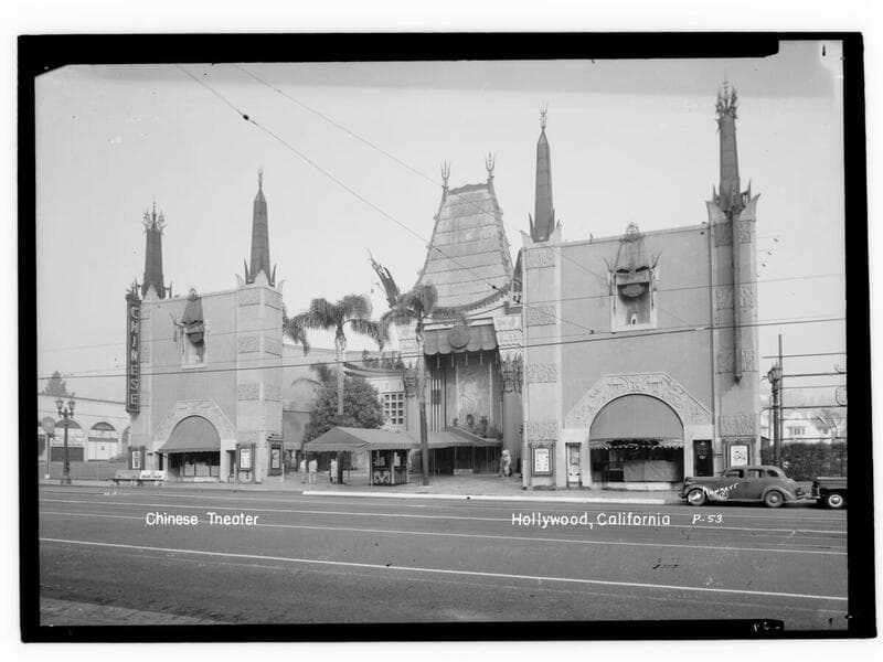 Image of the entrance to Grauman's Chinese Theatre with automobiles parked on Hollywood Boulevard in Hollywood, California, and people walking around the front courtyard looking at the Imprints of the Stars. Signs read "Poggi's fountain cigars, candies sandwiches coffee sodas," "Grauman's" and "Chinese."