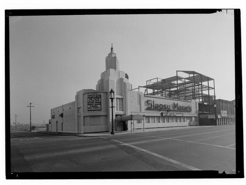 Image of Slapsy Maxie's comedy club on Wilshire Boulevard, as seen from Masselin Avenue, in Hollywood, California, with signs reading "Slapsy Maxie's" and "Gruen time Phil Foster, Lillian Roth, Roland Dupree, Shirley Sharon & Wanda, Dick Stabile." Building sites, with a crane and steel girder construction is visible at right and left.