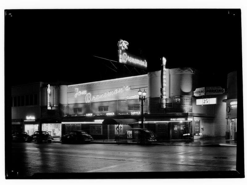 Image of a nighttime view of Tom Breneman's Hollywood Restaurant at 1539 North Vine Street in Hollywood, California, with a neon sign for the restaurant that reads "Glorifried Ham n' Eggs From Pan to Mouth" and a banner reading "Ted Fio Rito and his Orchestra." The old Tom Breneman's restaurant is visible down the block.