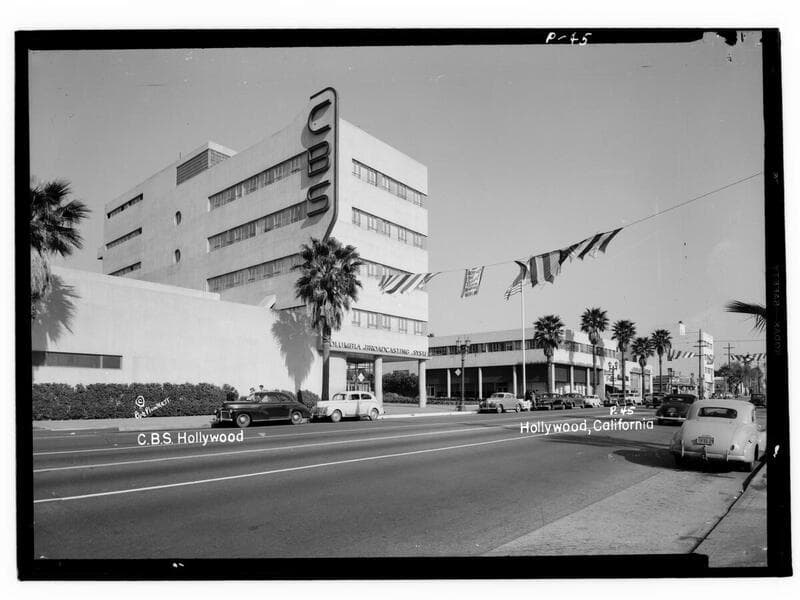 Image of a street view of the Mutual Don Lee Broadcasting System building on Vine Street and Afton Place in Hollywood, California, with a 1949 Cadillac convertible displayed in a show room style window. A sign for Saint George Hotel Apartments is visible at left.