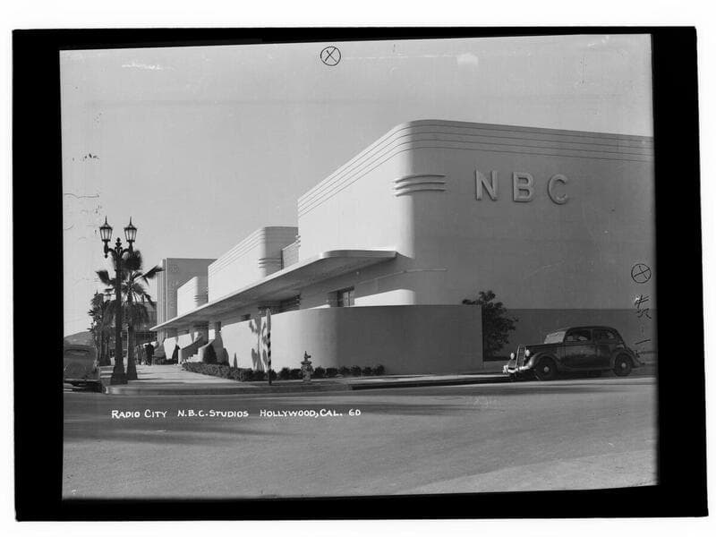 Image of Radio City, a National Broadcasting Company studio on Sunset Boulevard in Hollywood, California, with signs that read "Studio A. National Broadcasting Company Inc. Studio B." and "radios, records, sheet music" in the distance.