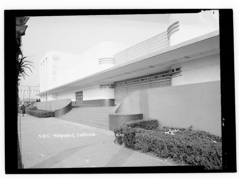 Image of a street view of people walking in front of Radio City, a National Broadcasting Company studio on Sunset Boulevard in Hollywood, California, with signs for "studio A" "studio C" "RCA" and "NBC."