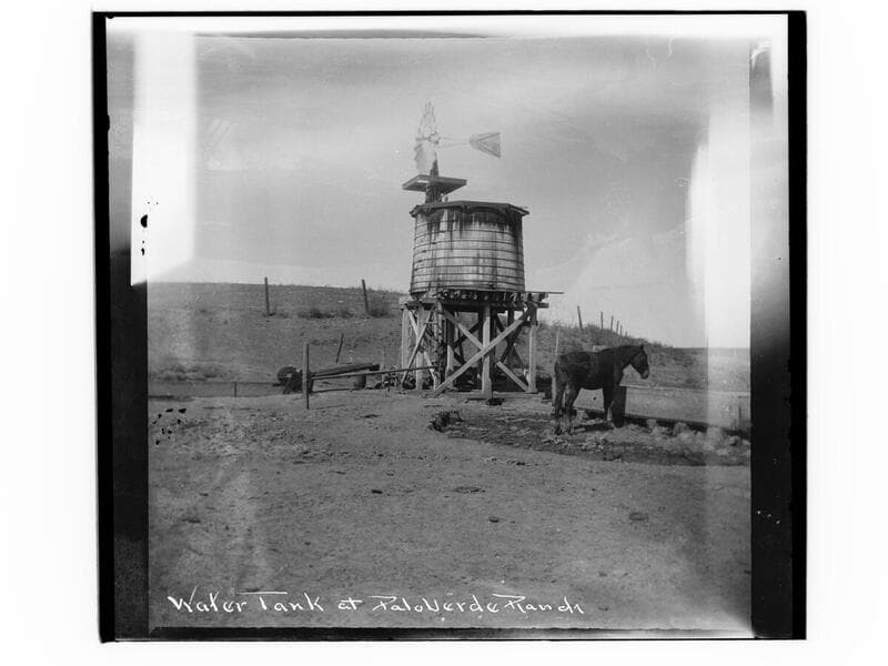 A water well on Rancho de los Palos Verdes (present-day Palos Verdes Peninsula and parts of San Pedro and Torrance, California). A water tank and windmill can be seen in the distance, on the right.