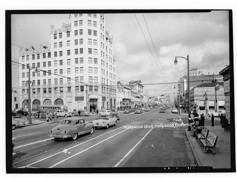 Image looking towards Sunset Boulevard from the intersection of El Centro Avenue in Hollywood, California, with the Palladium theater at center, Radio City NBC Studios at far left and the Broadway Building in the distance at right. The Palladium marquee reads "Jerry Gray and his Orchestra" next to a storefront with a sign for Photostats - Music Prints"