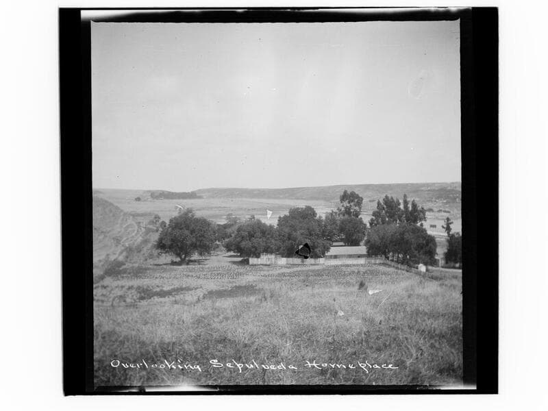 View of ranch buildings of the Sepulveda family, on the Rancho de los Palos Verdes (present-day Palos Verdes Peninsula and parts of San Pedro and Torrance, California). Another source identified this location as the Diego Sepulveda ranch, San Pedro (see notes, below).