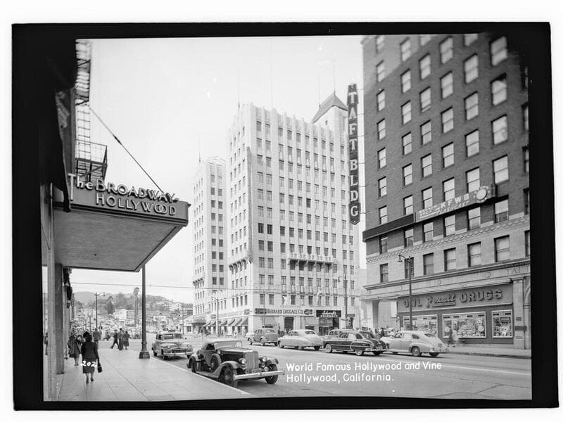 Image of the intersection of Hollywood Boulevard as seen from Vine Street in Hollywood, California, with the Taft Building and Owl Rexall Drugs at left and the Broadway Hollywood Building at right. A flier attached to a newspaper dispenser reads "Ken Murray's Blackouts shows," "KFWB Warner Bros.," and "Owl Rexall drug" are posted on the Taft building.