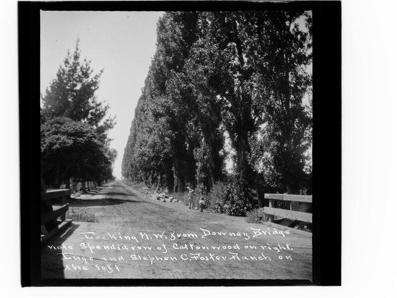 Looking N.W. from Downey Bridge. Note splendid row of Cottonwood on right. Lugo and Stephen C. Foster Ranch on the left