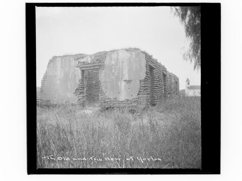 Image of adobe ruins attributed to the Yorba family on Rancho Canon de Santa Ana (present day Yorba Linda, California). The old adobe Yorba Chapel; San Antonio de Padua de Santa Ana, and the new St. Anthony Chapel, can be seen in the distance.