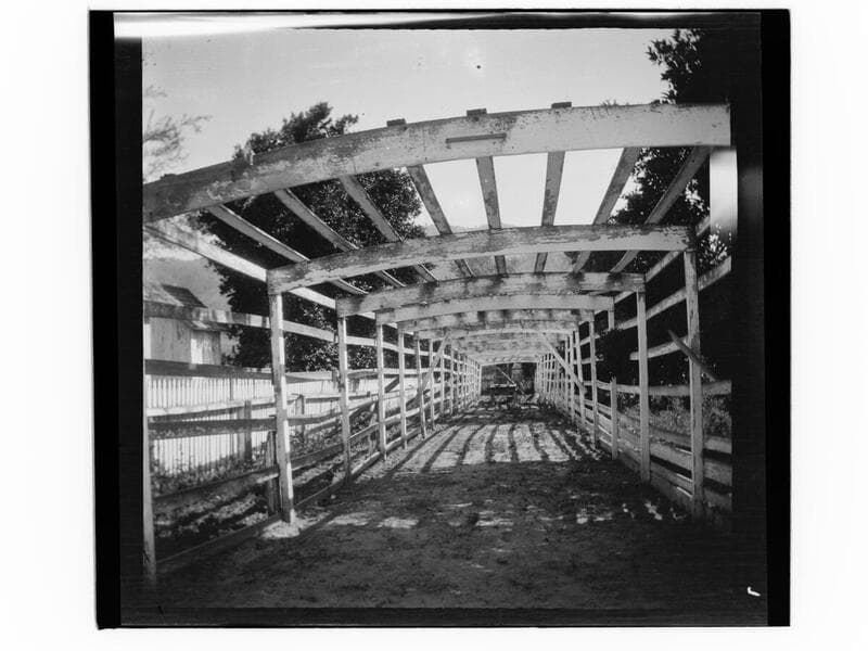 Bells hanging from a structure next to a wooden fence at Rancho Camulos, near Piru in Ventura County, California.