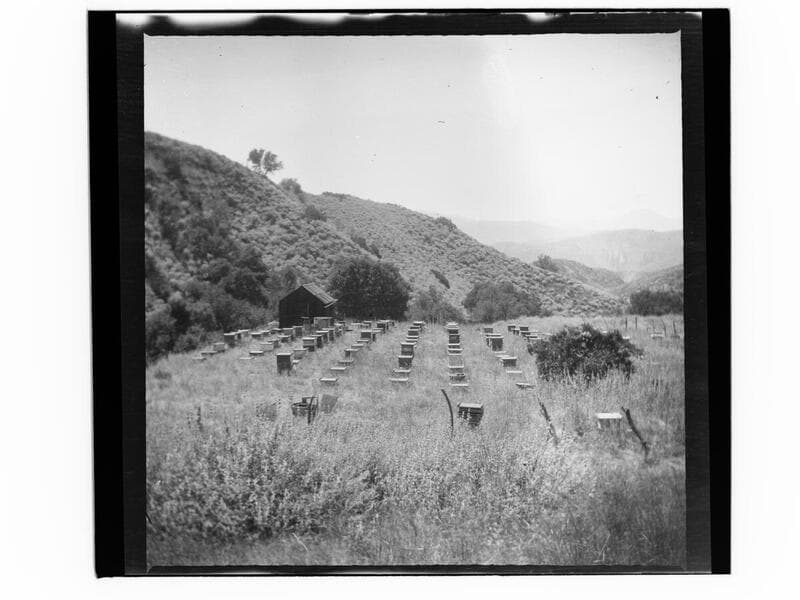 Seen from a distance, two small buildings in a grassy meadow amid a scattering of hive boxes in San Gabriel (presumably now in the San Gabriel Mountain foothills around Sierra Madre, California).