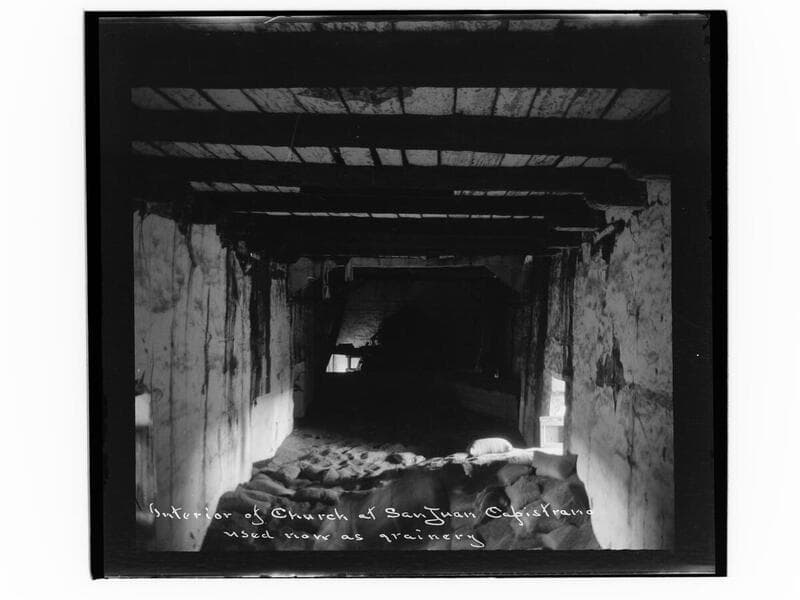Interior of church at San Juan Capistrano, used now as grainery