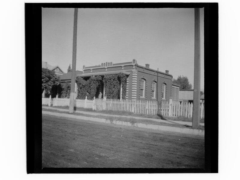 View of a large brick house with Mansard roof, seen from the back and side. Identified as the home of John Downey, governor of California from 1860 to 1862, on South Main Street near 3rd Street, Los Angeles.