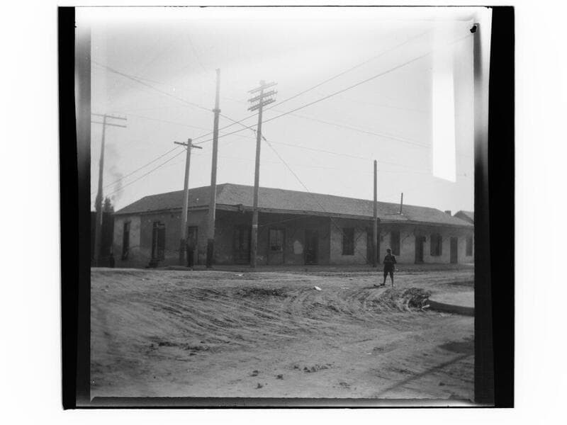 View of an adobe building at 714 Castelar Street in the Plaza section of Los Angeles (also called Sonora Town) on a dirt road, with a woman standing in the doorway and children are in the road, nearby.