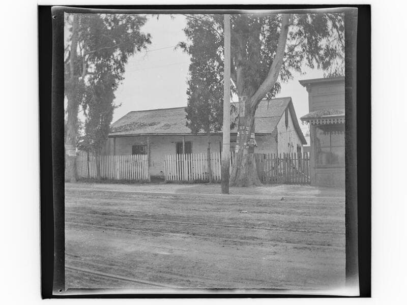 An adobe building with wooden window shutters and wooden fence on a city street. A man is standing near the doorway at right.