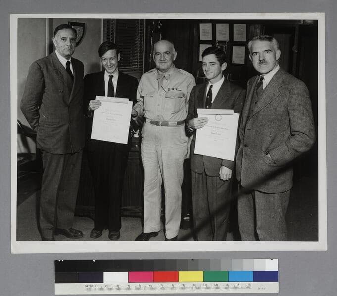 Edwin Powell Hubble, Franklin V. Reno, Major General Harris, Thomas D. Carr and an unidentified man, with Reno and Carr holding certificates of recognition from the U.S. War Department