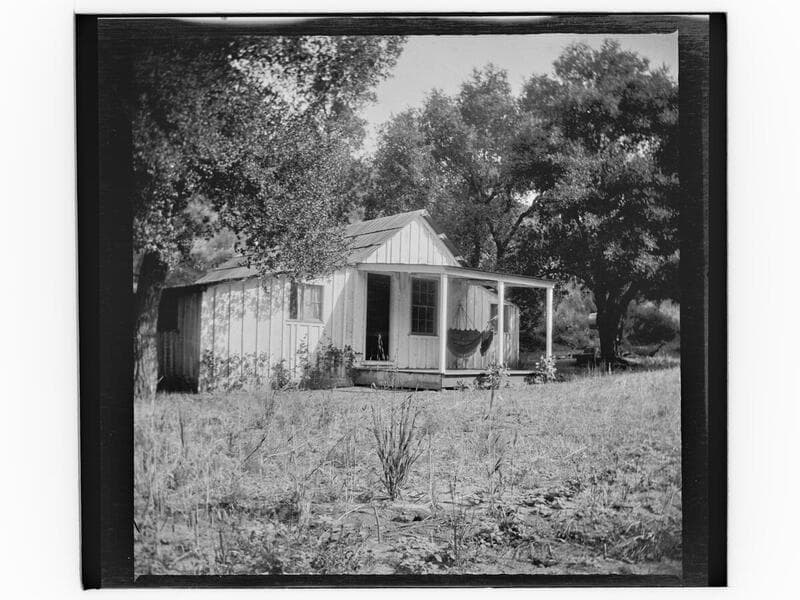 A house with porch, large yard, including trees, furniture, and a hammock. The yard has a lawn and a push lawn mower is propped against the house.