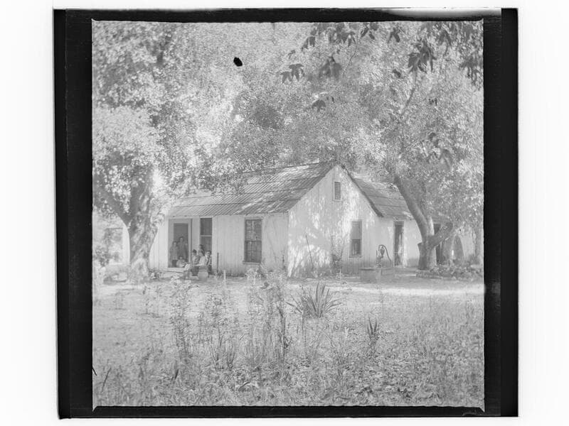 A cabin in a wooded area, next to trees. Possibly cooking items are hanging outside door, with shovel and water faucet near house.