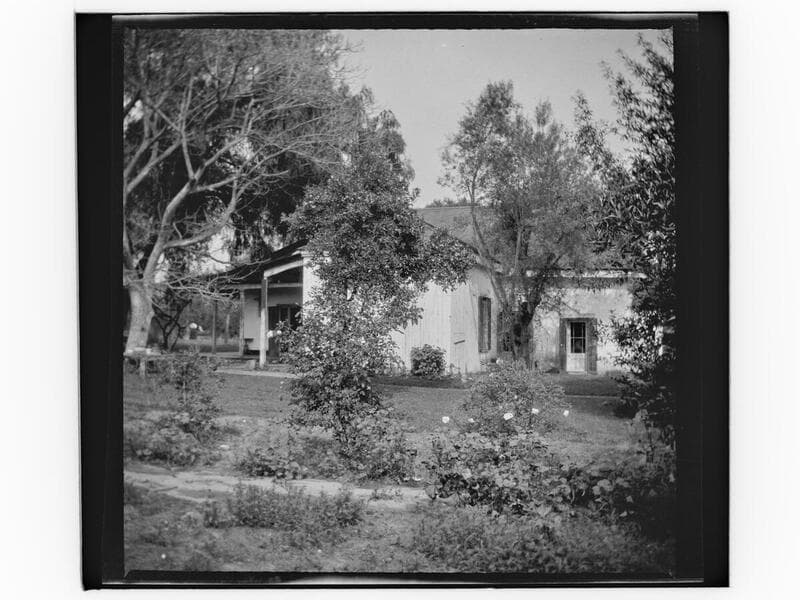 Two women standing in front of a house with a vegetable garden. There appears to be tomatoes growing in the foreground. Chairs are on the front porch of the house.