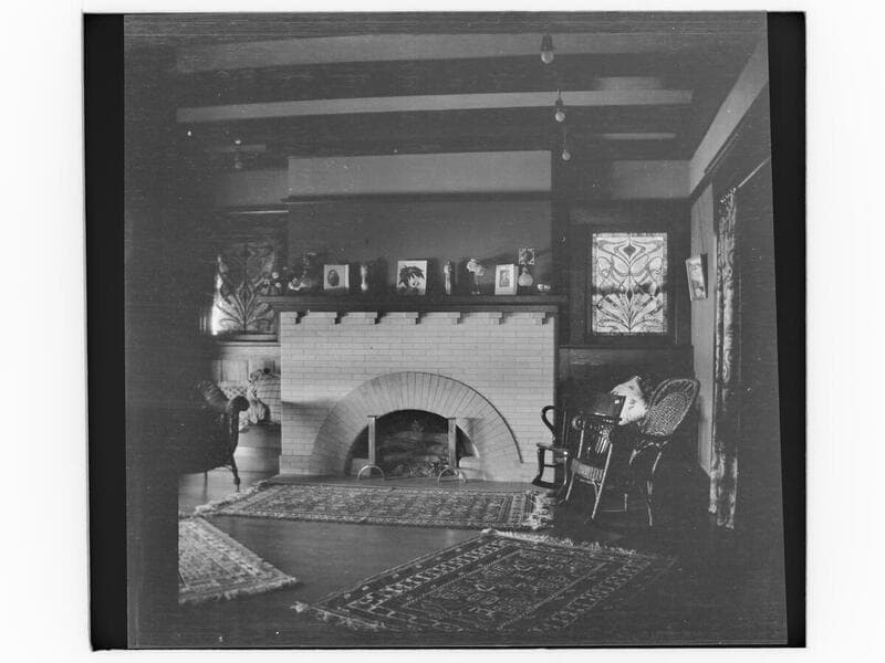 Image of a sitting room in an unidentified California house with Arts and Crafts style interior and Strowger dial telephone. There are furnishings, ceiling lamp, books in a bookcase, and framed photographs.