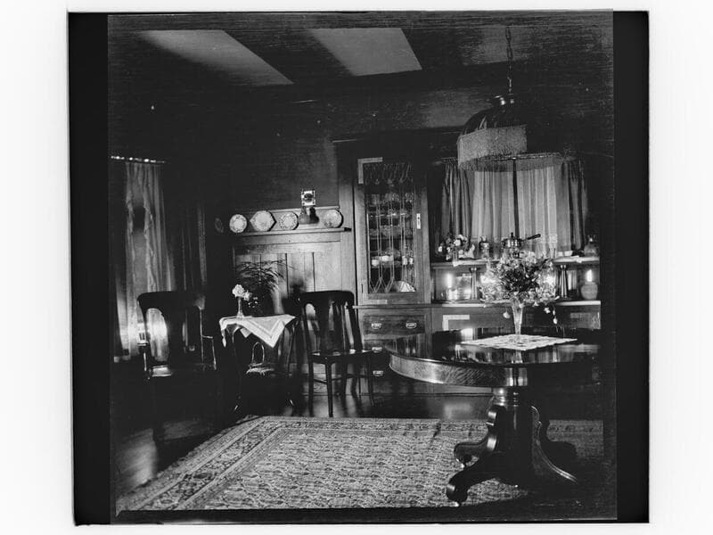 Image of a sitting room in an unidentified California house with Arts and Crafts style interior and Strowger dial telephone. There are furnishings, ceiling lamp, books in a bookcase, and framed photographs.
