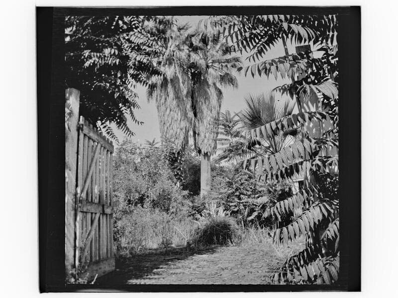 Two palm trees and garden at Wozencraft residence, San Bernardino