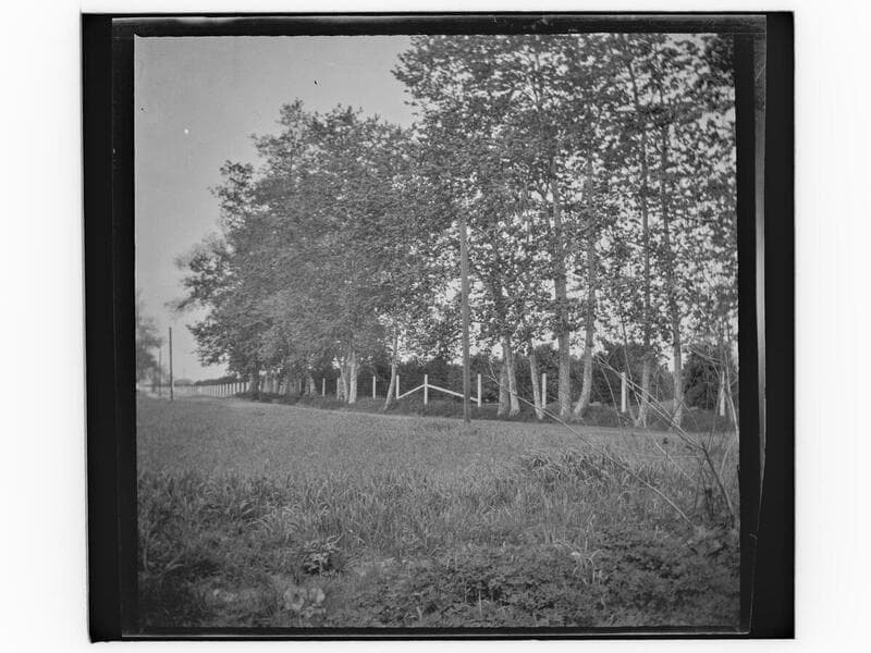 View of a tree-lined country road with fence; people and a horse and buggy stopped in the distance.