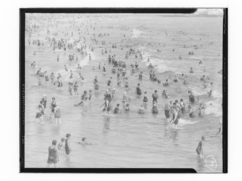 Image of beachgoers on the beach and playing in the surf in front of beach clubs in Santa Monica. The club buildings are: Deauville Club (far right), Santa Monica Athletic Club (center), and the Wavecrest Club (left).