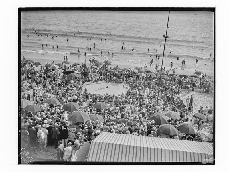 Image of a crowd watching pugilists boxing in an outdoor circus ring on the beach in front of the Deauville Club in Santa Monica, California. People can be seen swimming in the ocean in the background.