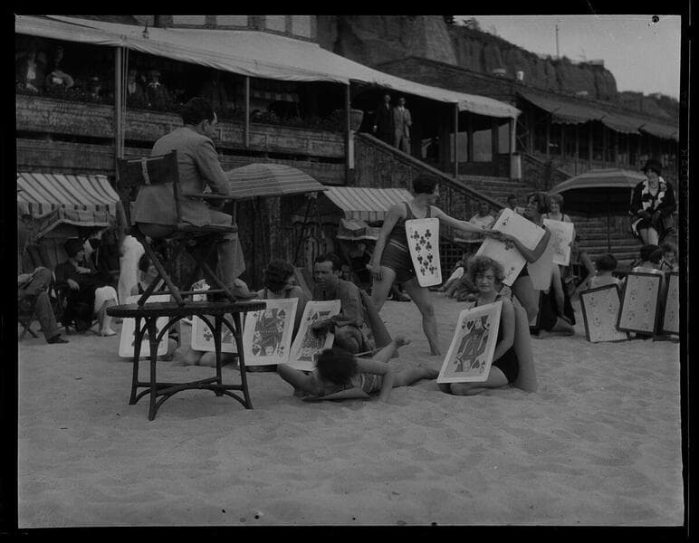 Image of people in swimsuits wearing sandwich board playing cards for a human card game on the beach in front of the Gables Beach Club in Santa Monica, California, with onlookers in swing chairs and on a covered veranda.