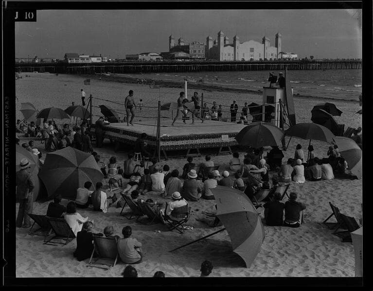 Image of a crowd amid beach umbrellas watching two wrestlers in an outdoor boxing ring on the beach in front of the Santa Monica Athletic Club in Santa Monica, California. The Santa Monica Athletic Club building and a cafe sign advertising "Clam Chowder" can be seen in the background. The man in the bottom right corner is wearing shorts with the initials "LAAC," for the Los Angeles Athletic Club.