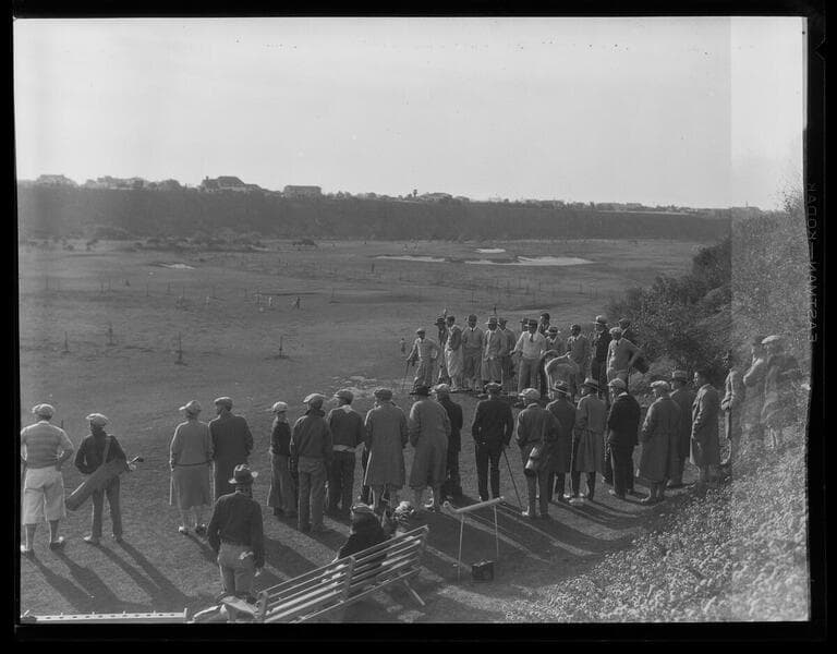 Image of a gallery of viewers watching professional golfer Leo Diegel swinging a golf club at the Riviera Country Club in Santa Monica Canyon in Pacific Palisades California; with golfer Tommy Armour walking to his left.