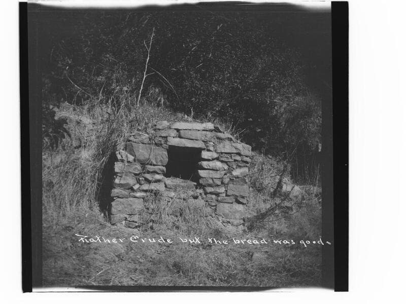 Landscape view of the canyons, trees, and hills of Malibu, California. There are a few small structures, possibly houses, in the canyon.