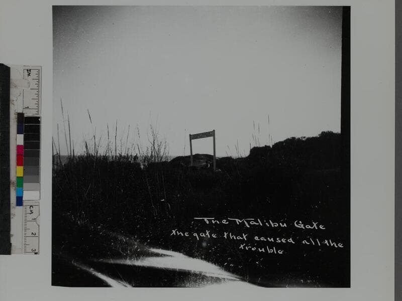 Image of a billboard on the beach advertising the Malibu Cove Colony, next to construction equipment, in Malibu, California, with automobiles on the highway in the distance. The sign reads "New exclusive Malibu Cove Colony, finest sheltered beach, limited offering of choice beach lots, Malibu Development Co, and associates" with a smaller sign for "Robert Lee Myer Const. Co."