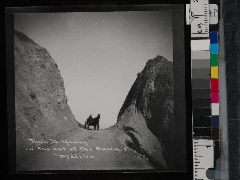 View of a man in a wagon, passing under a gate with a sign that reads "Malibu Rancho - Trespassers Strictly Prohibited." The land (present day Malibu, California) at this time was owned by Frederick and May Knight Rindge.