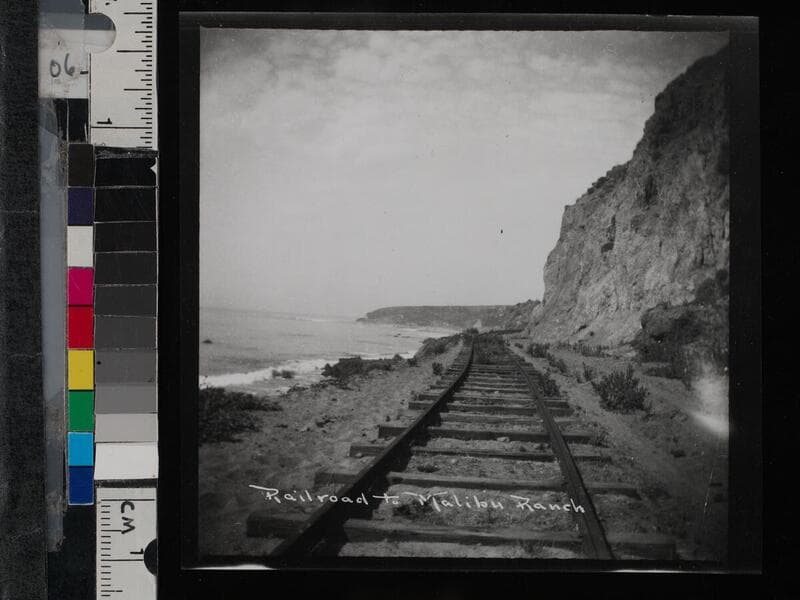 View of railroad tracks of the Rindge railway (incorporated as the Hueneme, Malibu and Port Los Angeles Railway) running toward the beach in Malibu, California.