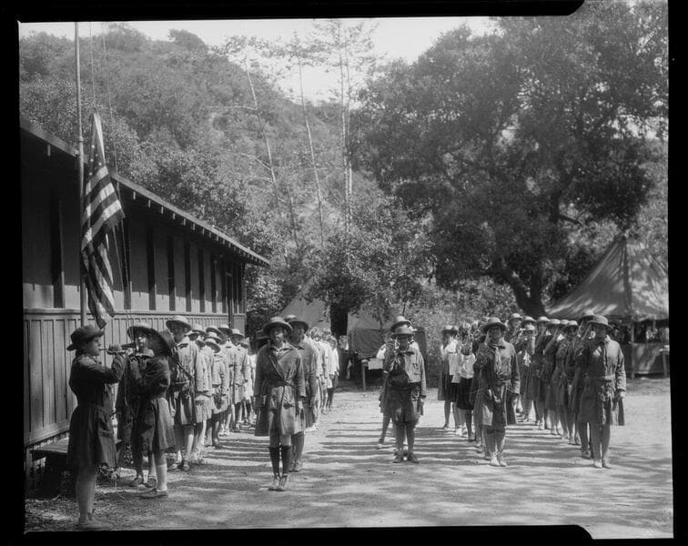 Girl Scout troop standing in formation, Santa Monica Girl Scout camp