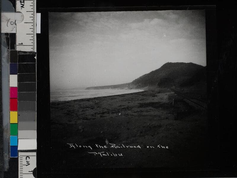 View of a railroad trestle bridge for the Rindge railway (incorporated as the Hueneme, Malibu and Port Los Angeles Railway) in Malibu, California.