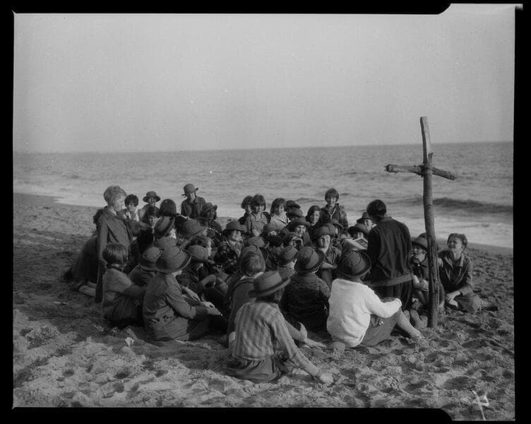 Image of a group of Girl Scouts sitting with a wooden cross during a prayer meeting on the beach at Santa Monica Girl Scouts camp in Pacific Palisades, California, a road with wood guard rails is seen in the distance.