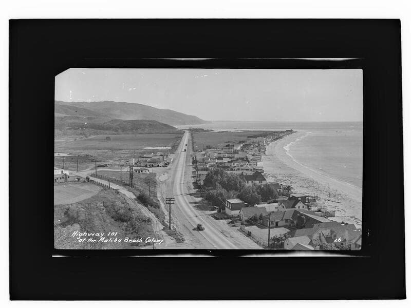 Aerial view of the Pacific Coast Highway in Malibu, California, with the beach houses of the Motion Picture Colony at right and the Malibu Beach Cafe and gasoline station and garage at left.