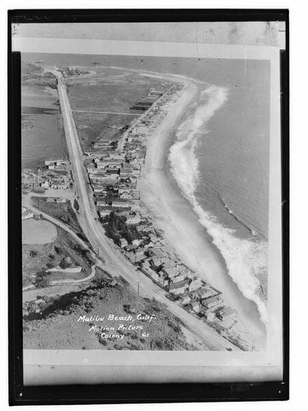 Image of the Roosevelt Highway (later Pacific Coast Highway) and houses in an area known as the "Motion Picture Colony" along the beach in Malibu, California.