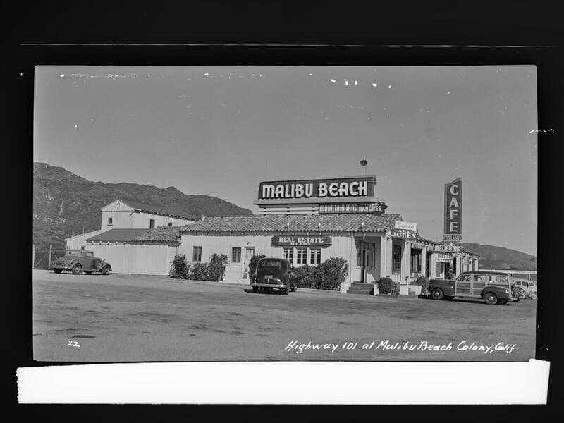 Image of storefronts and automobiles at 23807 Malibu Road along the Roosevelt Highway (later Pacific Coast Highway) at the Malibu Movie Colony in Malibu, California. Signs advertise "Malibu Beach," "Art Jones Malibu Real Estate," "Malibu Inn Cafe," "Lobsters," and a liquor store.
