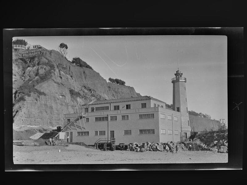 Elevated view of the Roosevelt Highway (later Pacific Coast Highway), Santa Monica Bay, and coastline with the Lighthouse Bathhouse on the beach next to the remains of the Long Wharf stone jetty in Pacific Palisades, California. The Santa Monica Pier can be seen in the distance at upper left center. A sign for "Huntington Palisades" is seen at left edge of image.