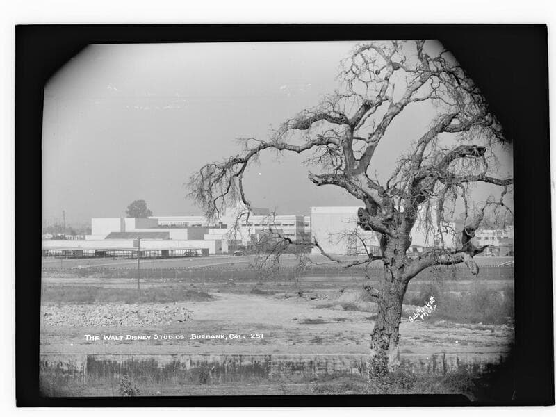 Image of an entrance to Walt Disney Studios in Burbank, California, with buildings and signs for "Walt Disney Productions" and "Saint Joseph Hospital" visible, as well as a water tower and the Verdugo Mountains in the background.