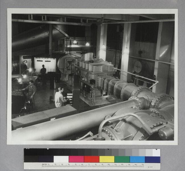 Equipment, machinery, and unidentified men working with the supersonic wind tunnel in the U.S. Army Ballistic Llaboratory. Note in the hand of Grace Burke Hubble on verso: "EPH Supersonic Wind Tunnel, Huntington Library Collection."