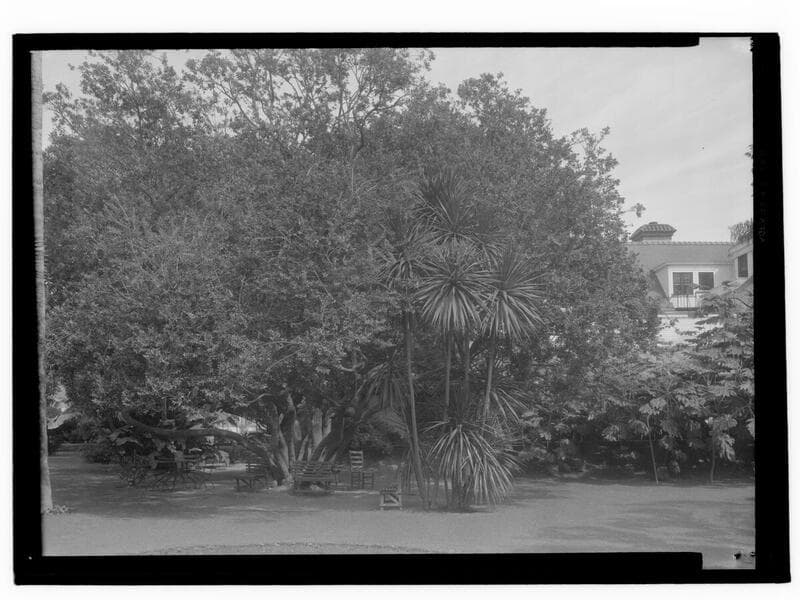 Image of trees and part of the building on the grounds of the Miramar Hotel in Santa Monica, California.
