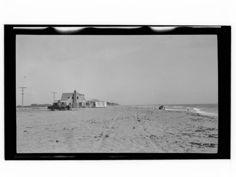 Image of a store and houses on the beach in Pismo, California, with an advertisement sign that reads "Lucky Strike cigarettes" on the side of the store.